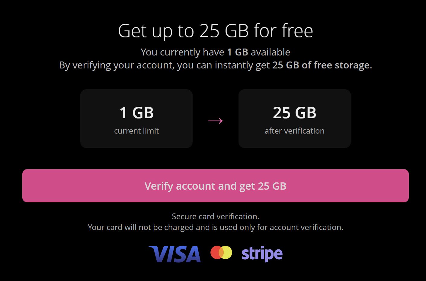 Want to get 25 GB of storage for free? Simply verify your account. The whole process is quick, secure, and only takes a few minutes.